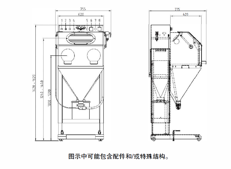 Front flap door which is operated with cylinders, supported by compressed gas, can be opened up to the working height of the microblasting equipment, with integrated sight window with a safety and an attrition-proof glass (double glass) in a quick change frame