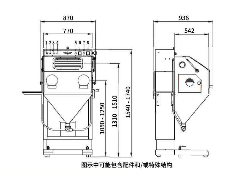 基本配置:正面铰链门,用气压缸支持开启,所配备的手臂支撑让作业. 配备集成在速换式框架里的和耐磨玻璃查看窗口,为了便于从正面给设备加料,也可用较重的工件;侧面加料门, 宽360 mm x 高290 mm, 左向和右向, 配双重垂直百叶帘. 用来轻松地给较长工件喷细砂;通过设备后壁的一根手摇柄来手动液压调节高度的双柱升降机(免维护) -联系电话:021-33522330