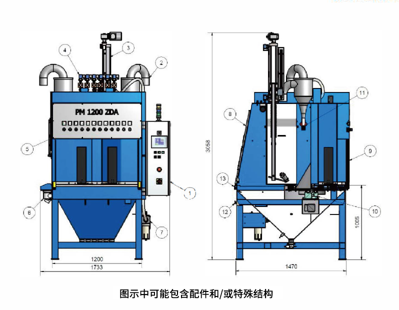 该机器能够对大批量小零件进行喷砂处理。 将批量零件放入旋转篮,且在同一个篮内进行两个加工阶段的喷砂。
