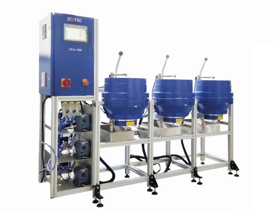 ZOTEC's newly developed 3-cylinder tray centrifugal polishing machine, with dimensions of 2650mm long * 880mm wide * 1620mm high, a total weight of 580KG, a total power of 9.0KW, and a working voltage of 380 V. The three sets of work containers can be managed by a single touch screen for easy operation. The maximum speed of pallet can be stepless speed regulation of 250 rpm, the floor space is 50% smaller than 3 sets of single-cylinder equipment, and according to the customer's demand for optional automatic turning device, automatic spraying device and abrasive product separation device.